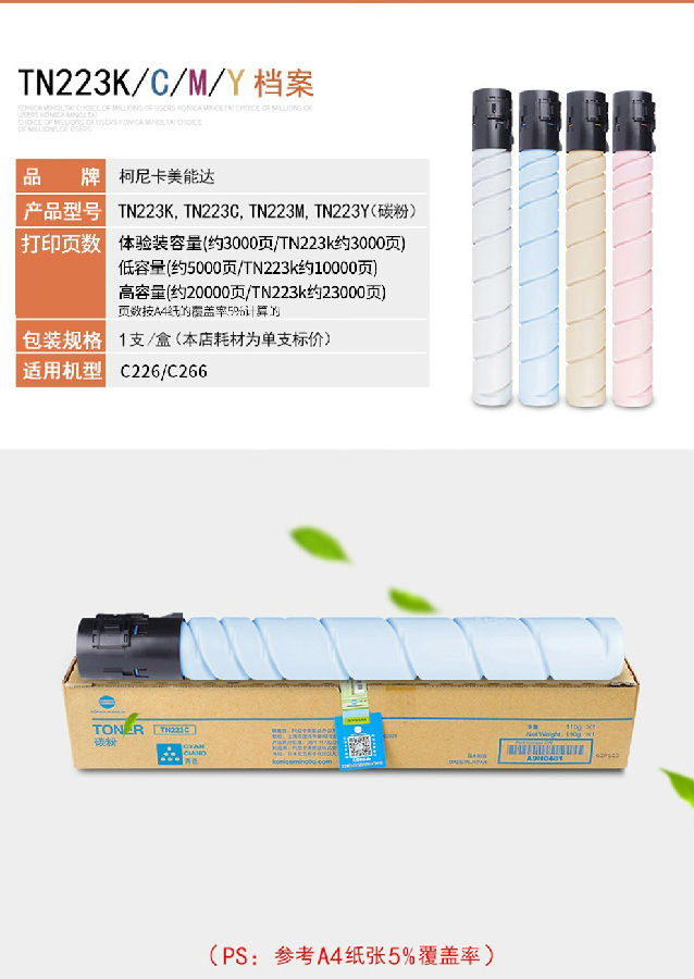 柯尼卡美能達(dá)(KONICA MINOLTA)TN223粉盒柯美C226/C266原裝墨粉盒碳粉 TN223C藍(lán)色