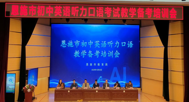 為響應(yīng)湖北省中考政策要求,加快推進(jìn)恩施市英語教師口語教學(xué)意識,培養(yǎng)學(xué)生英語聽說能力,10月25日,恩施市教育局在恩施思源實驗學(xué)校開展了恩施市初中英語聽力口語考試教學(xué)備考培訓(xùn)會。大會由恩施市教學(xué)研究和教師培訓(xùn)中心副主任董祖昌主持,出席本次活動領(lǐng)導(dǎo)有:恩施市教育局副局長劉靜,恩施市研培中心副主任董祖昌,恩施市研培中心初中室主任付勇,恩施市研培中心初中英語教研員康詠梅及恩施市各初中學(xué)校教學(xué)副校長、英語教研組長、各年級英語備課組長150余人。