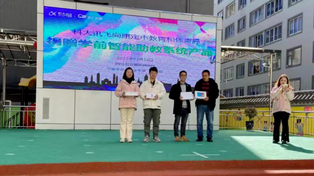 3月22日,正值春分,四川省甘孜州推普工作收到一份特殊禮物??拼笥嶏w股份有限公司在康定市和瀘定縣分別舉辦“助力甘孜州國家通用語言文字普及和學(xué)前學(xué)普”捐贈公益活動,向康定市第一幼兒園和瀘定縣瀘橋鎮(zhèn)幼兒園合計捐贈兩套教師普通話訓(xùn)練平臺和四套學(xué)前智能助教系統(tǒng)。這些產(chǎn)品覆蓋兩所幼兒園的8個班級,100多位教師。